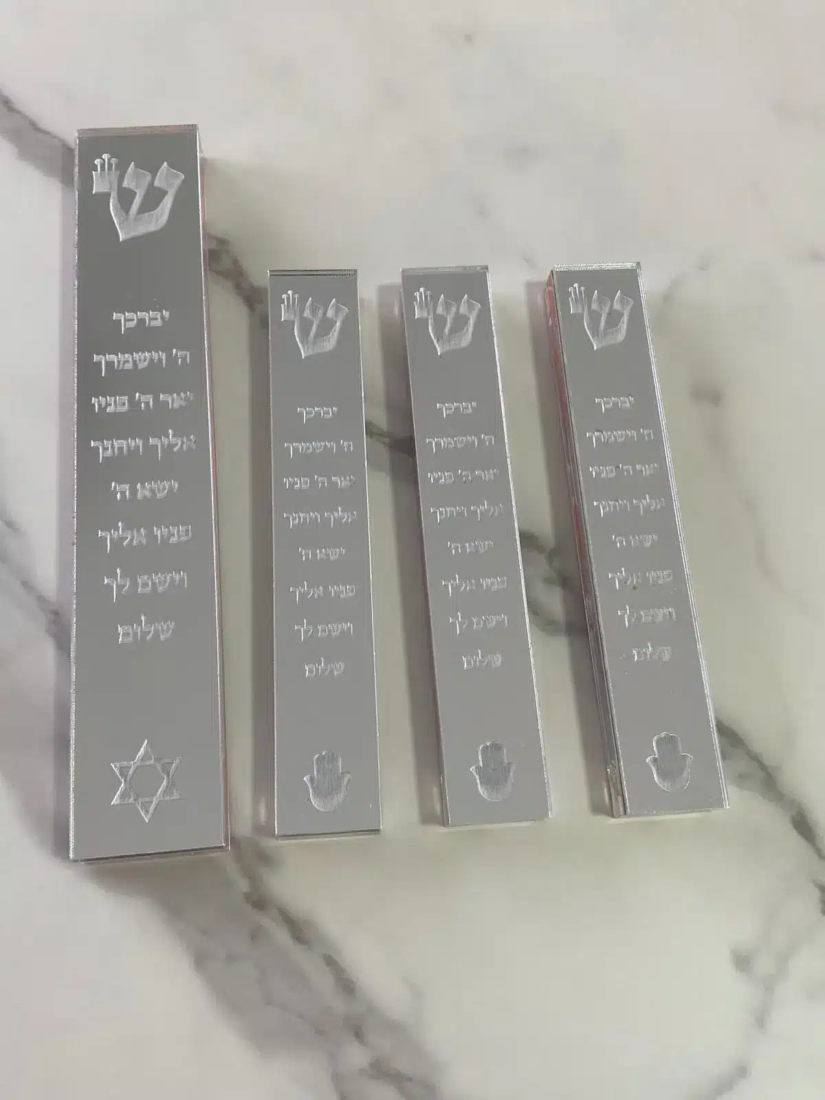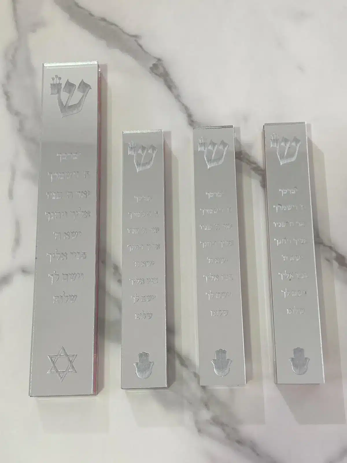 סט מזוזות בעיצוב אלגנטי מאקריל בצבע כסף-מראה ייחודי עם הכיתוב המרגש "יברכך ה'" המעניק לבית מראה מרשים, נקי ומכובד שתואם לכל סגנון עיצוב.