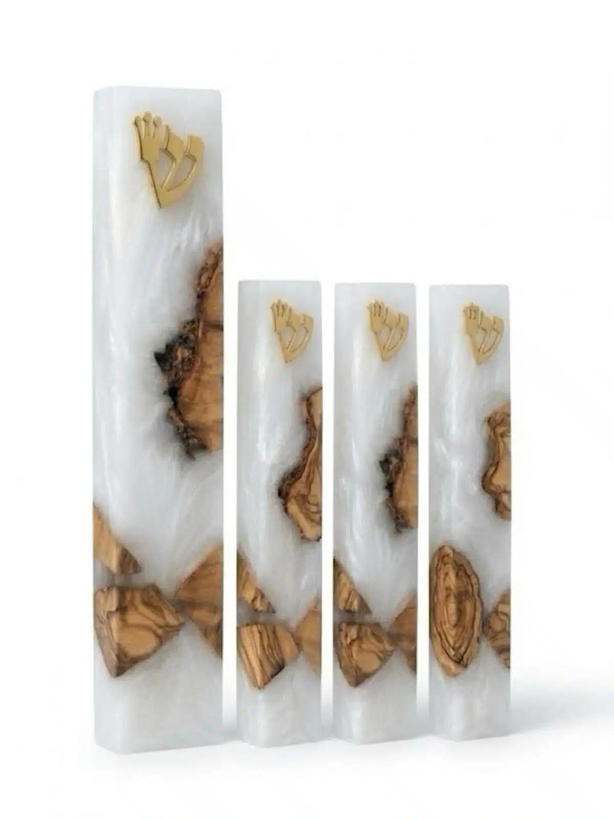 בית מזוזה ייחודי המשלב עץ טבעי ושרף אפוקסי בצבע לבן, בעבודת יד מוקפדת המעניקה לכל פריט מראה יוקרתי וייחודי. השילוב בין העץ הטבעי לבין האפוקסי הלבן יוצר עיצוב מודרני ונקי, וכל מזוזה מגיעה עם שין מודבקת בצבע זהב, המשתלבת בצורה מושלמת בכניסה לבית, למשרד או לכל חלל. כל סט מגיע מינימום עם בית מזוזה גדול ובית מזוזה קטן. בקניית חמש בתי מזוזה החמישית במתנה!